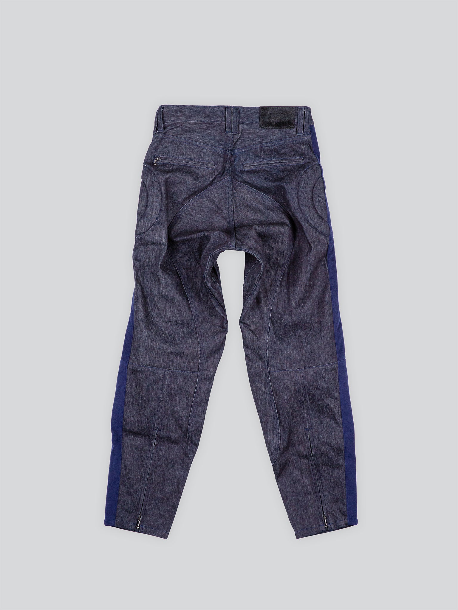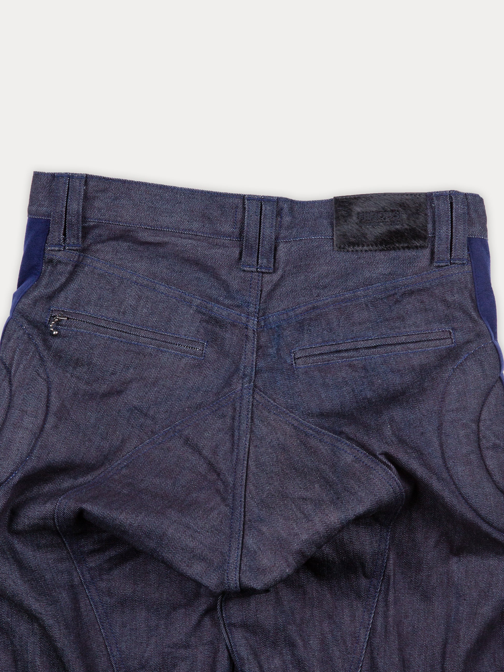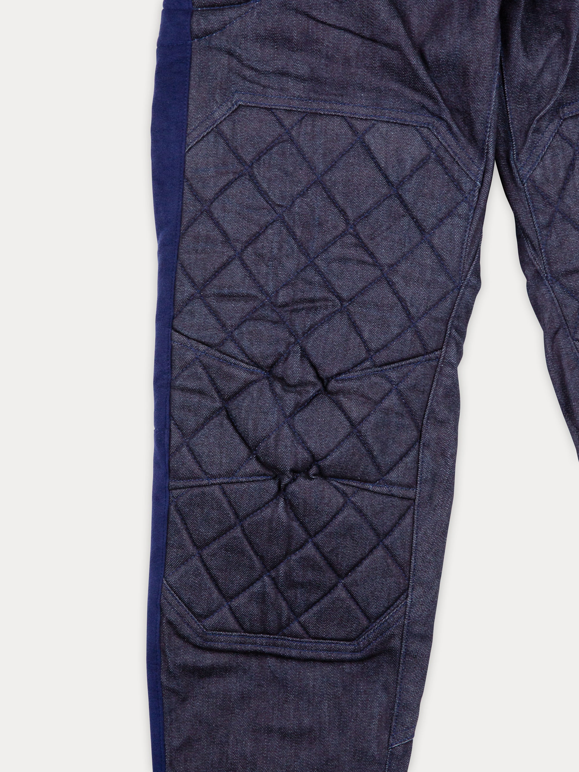 岡山県児島産。メタルボタンとジップで開閉。右フロントにスラッシュポケット。サイドと膝周りに反発性があるウレタンフォームを内側にキルティングを施し、膝を立体的に構築。右バックにスラッシュポケット。左バックにジップオープン、スラッシュポケット。尻当ては生地2枚仕立てで膝下まで続く。ヘムのバックは着脱しやすいオープンジップ仕様。股にマチを入れて突っ張りを無くし、運動機能を高めている。