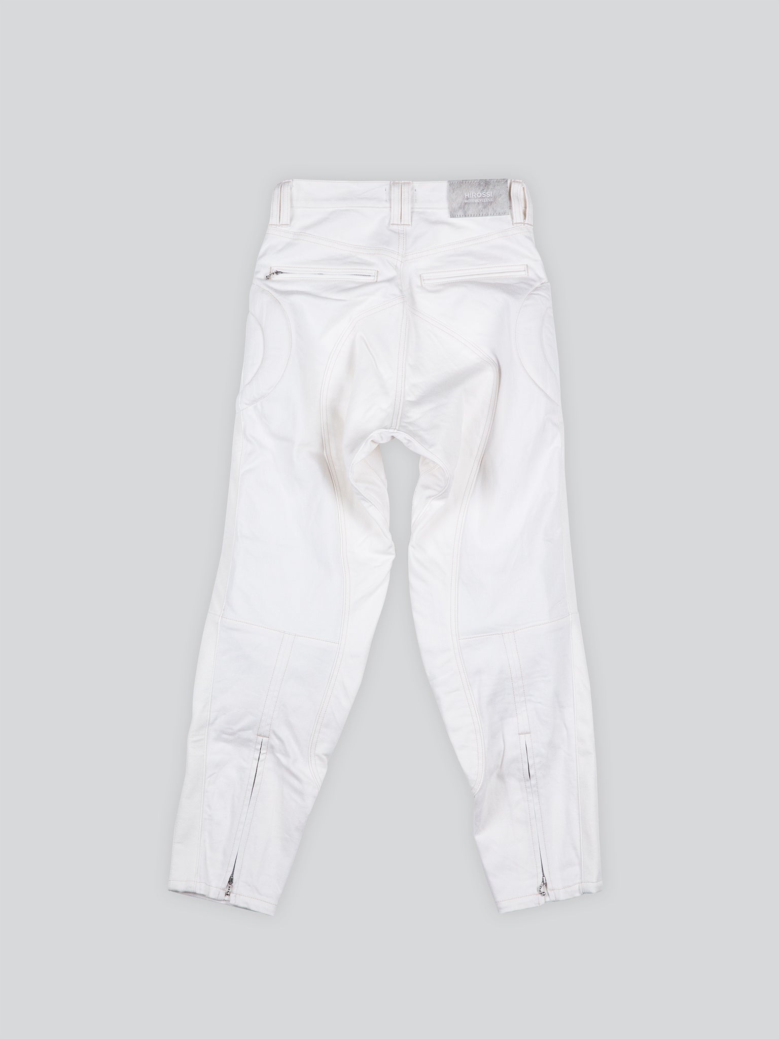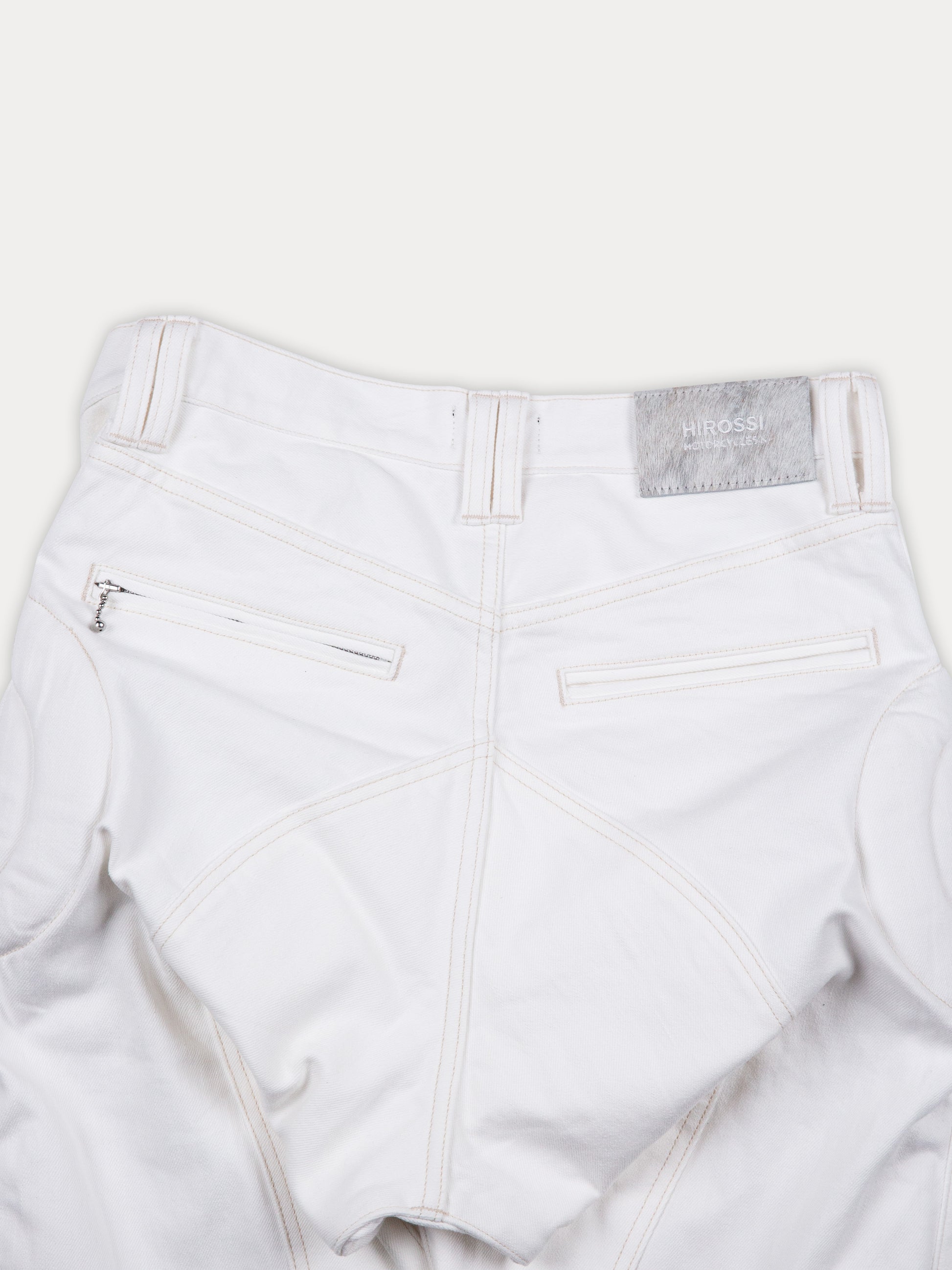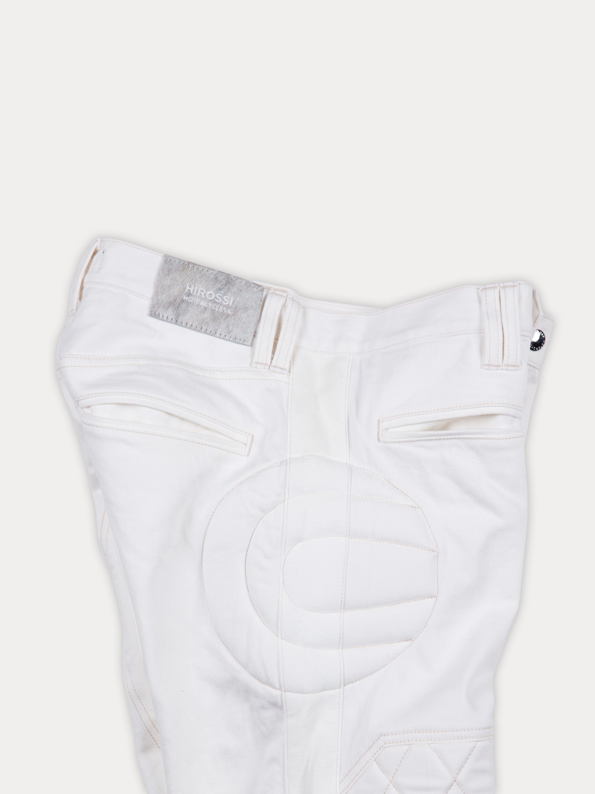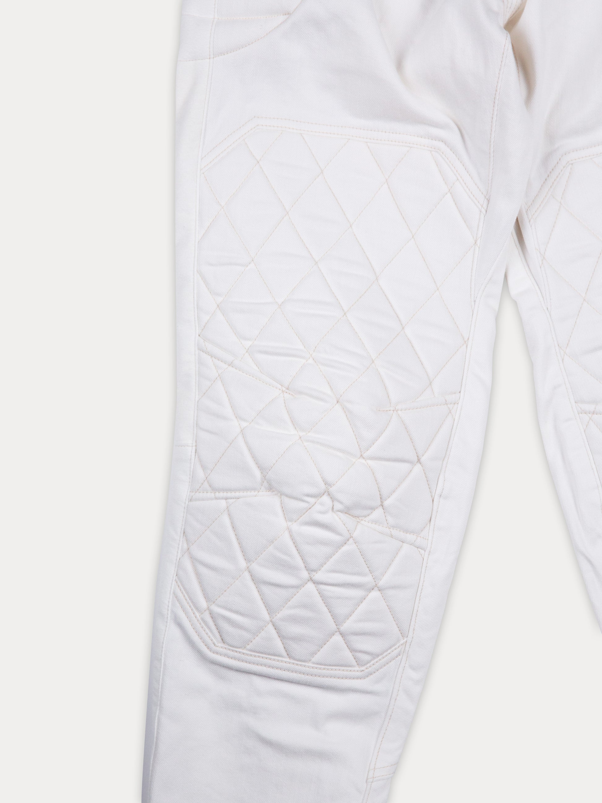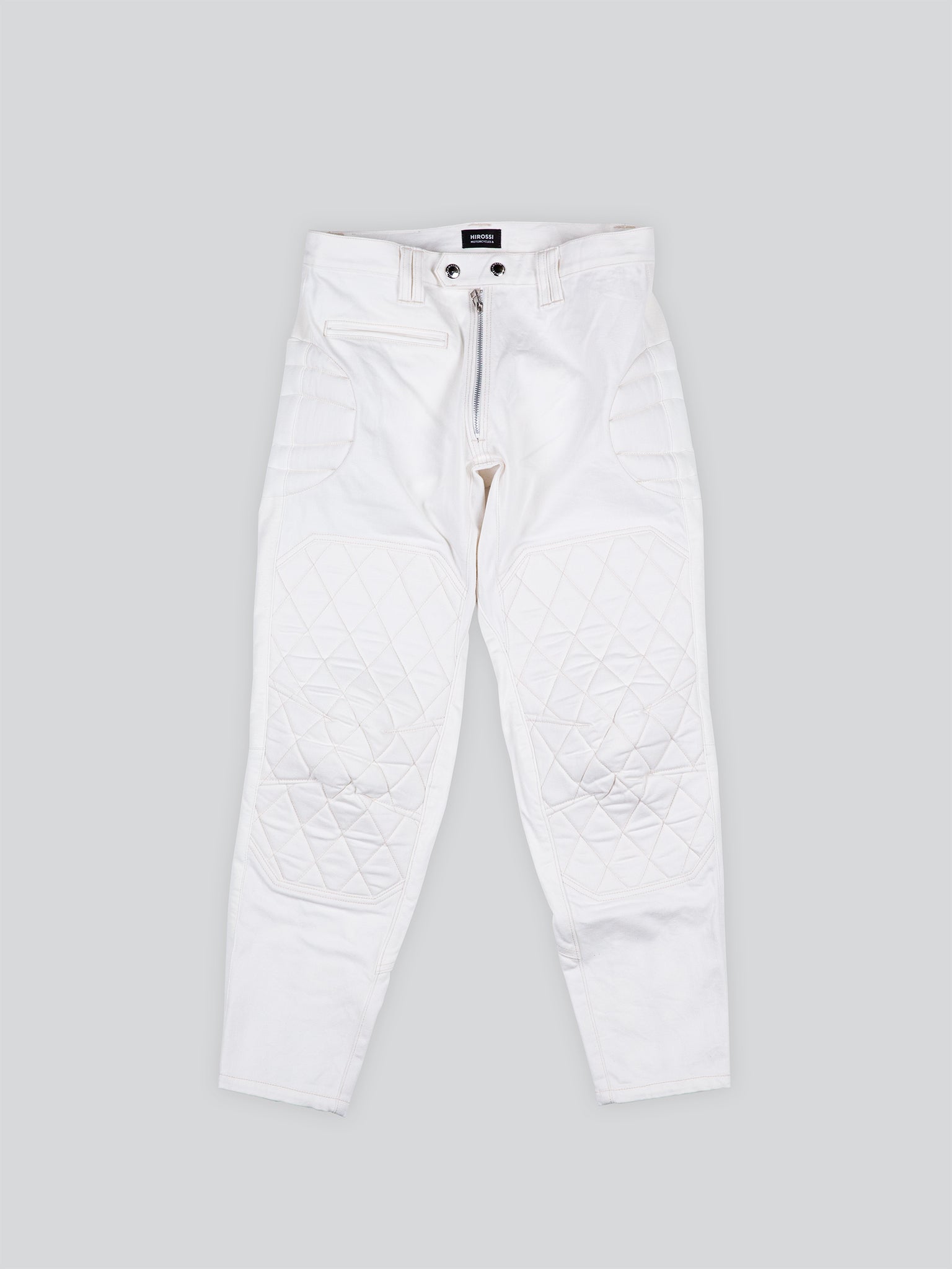 岡山県児島産。メタルボタンとジップで開閉。右フロントにスラッシュポケット。サイドと膝周りに反発性があるウレタンフォームを内側にキルティングを施し、膝を立体的に構築。右バックにスラッシュポケット。左バックにジップオープン、スラッシュポケット。尻当ては生地2枚仕立てで膝下まで続く。ヘムのバックは着脱しやすいオープンジップ仕様。股にマチを入れて突っ張りを無くし、運動機能を高めている。